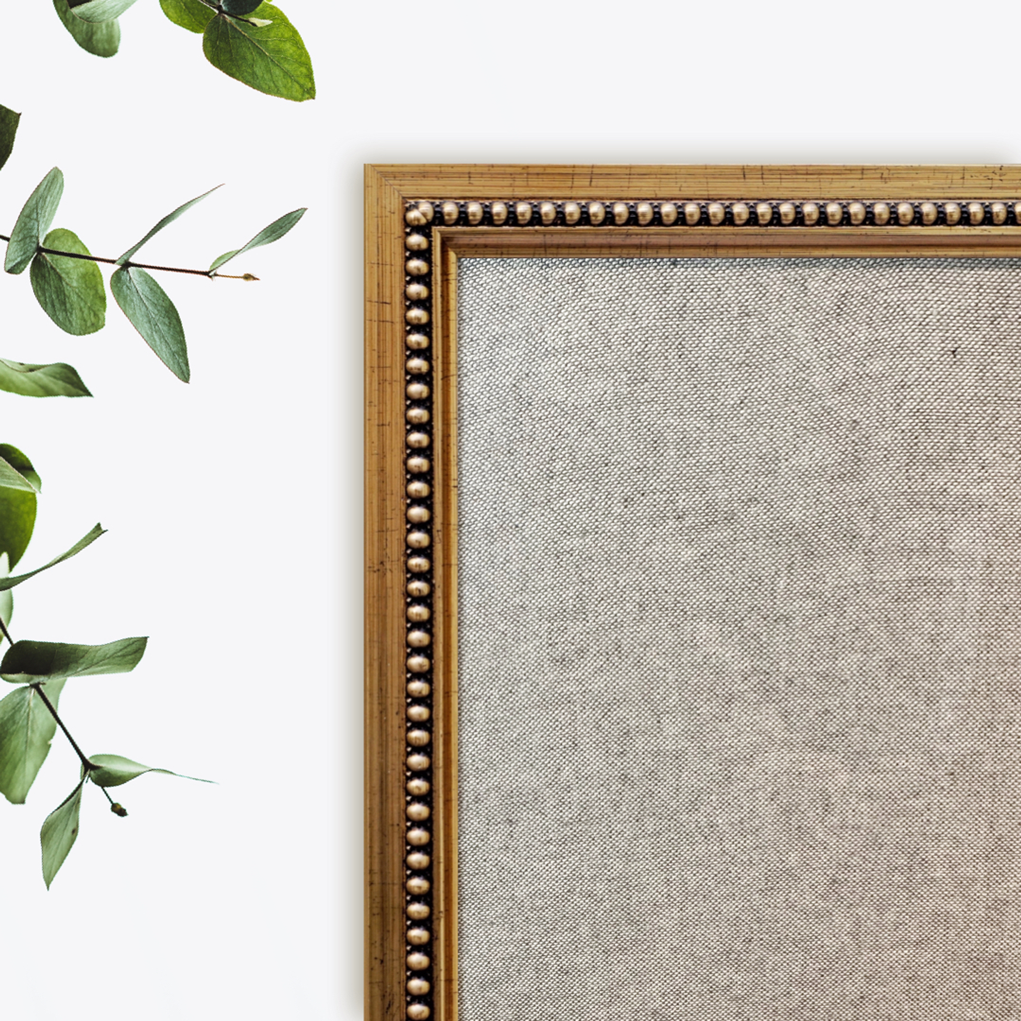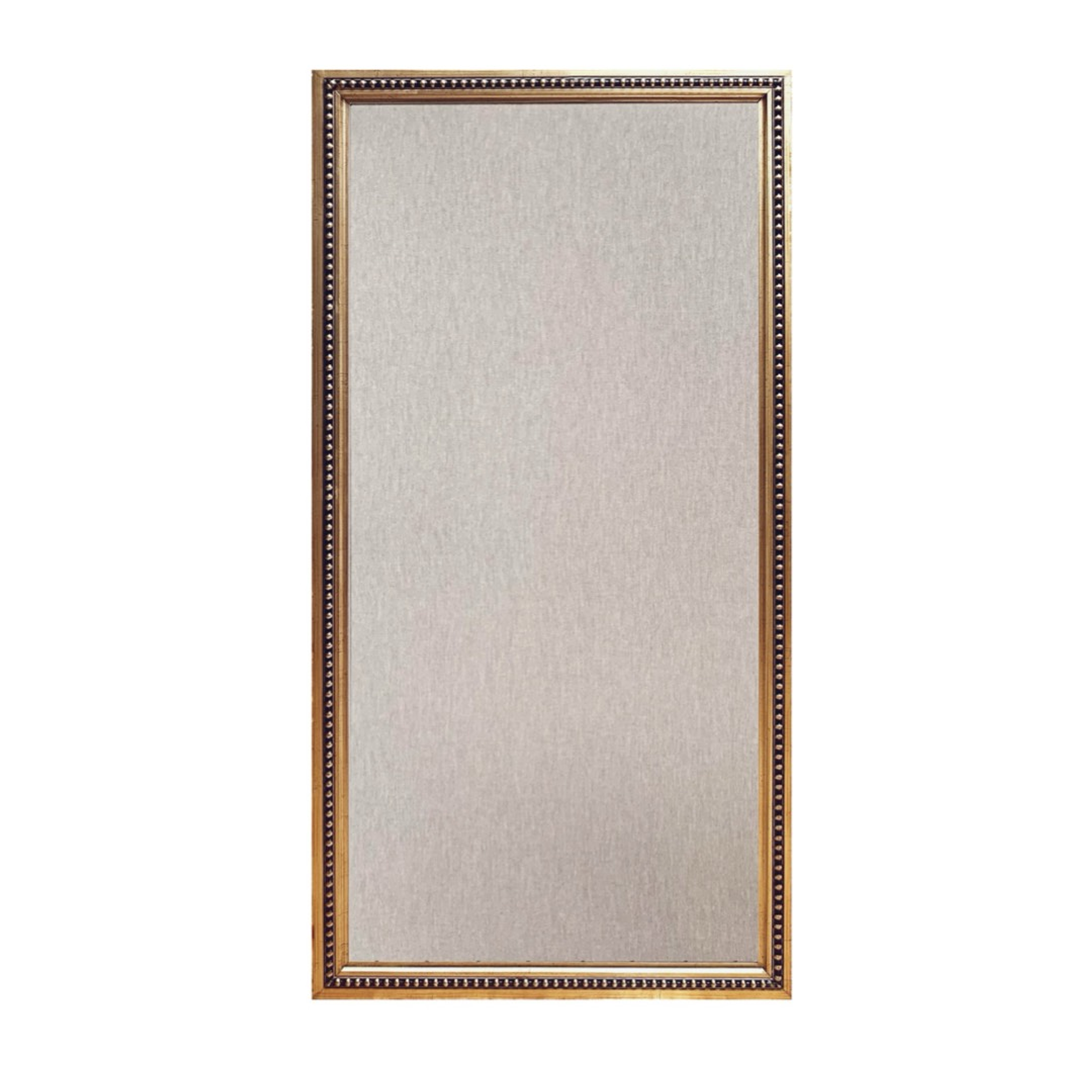 Mural de corcho forrado en tela con marco de madera dorado de 3,5 cm con perlitas.