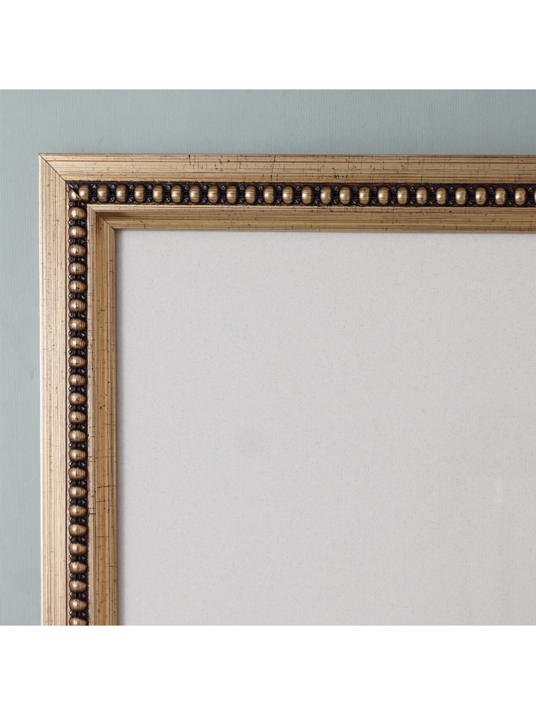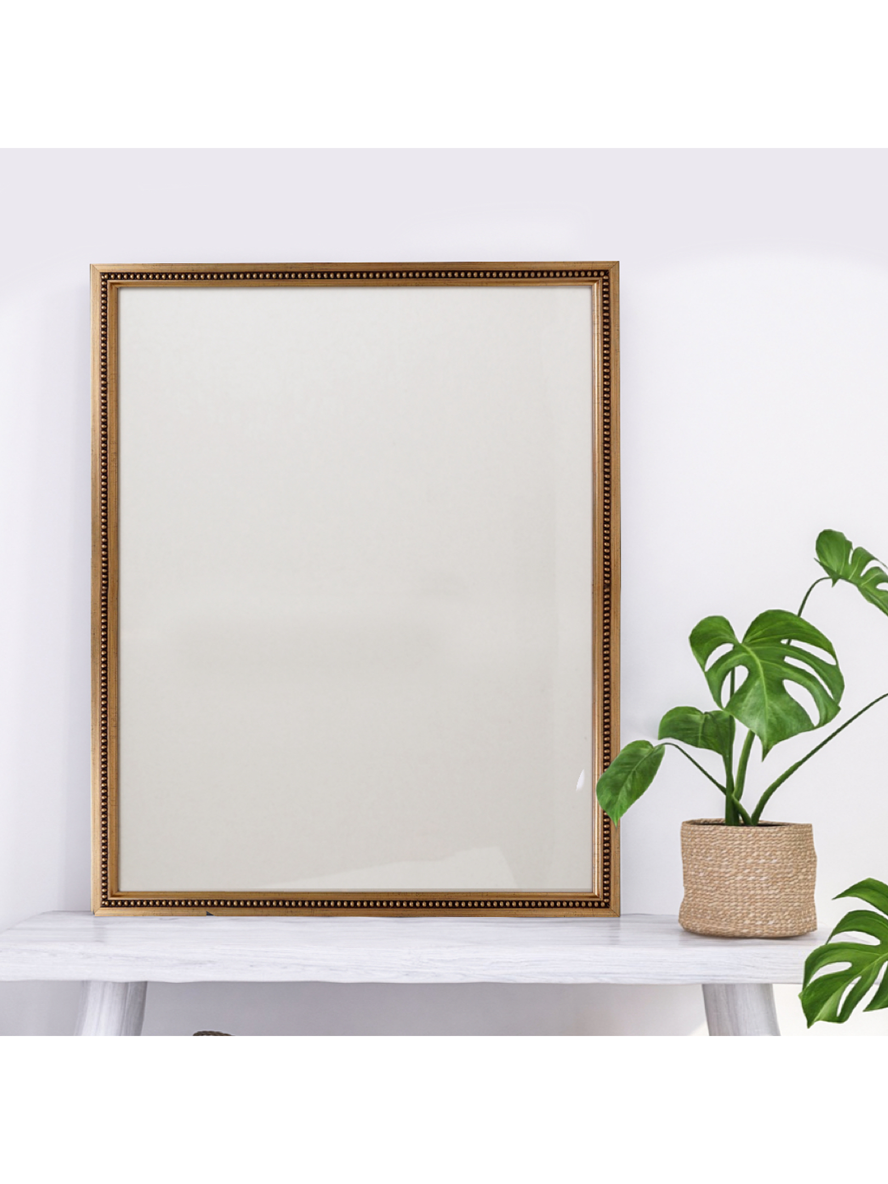 Pizarra de vidrio con fondo de color beige y marco dorado de 3,5 cm dorado con perlitas.